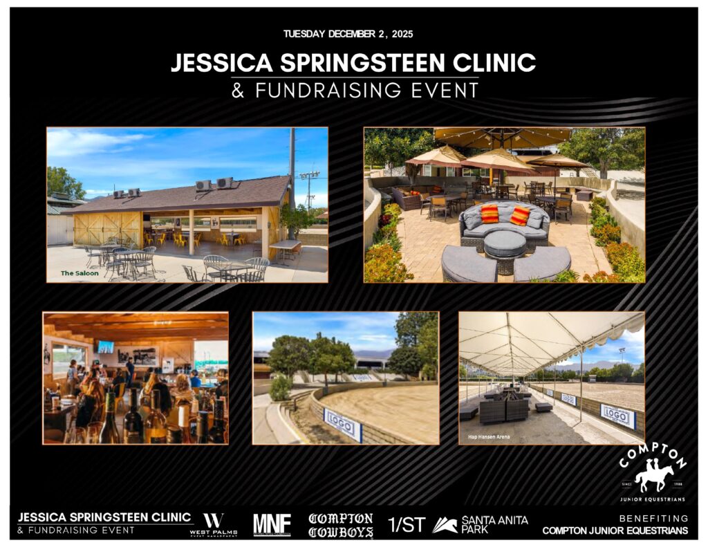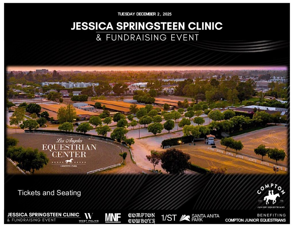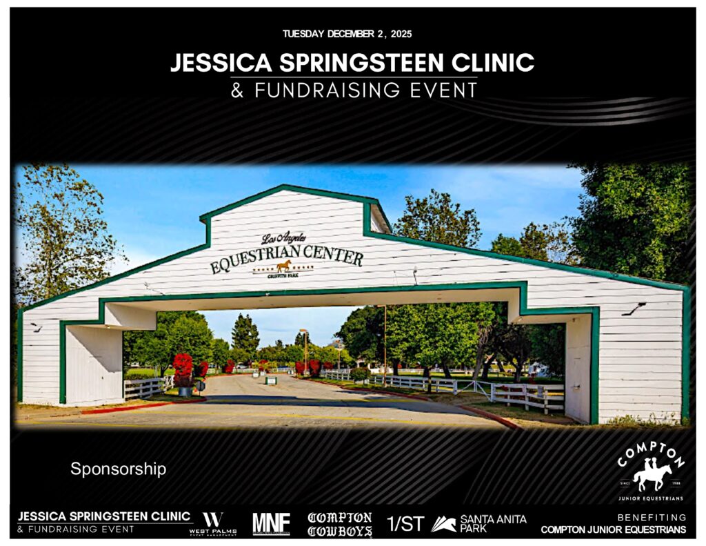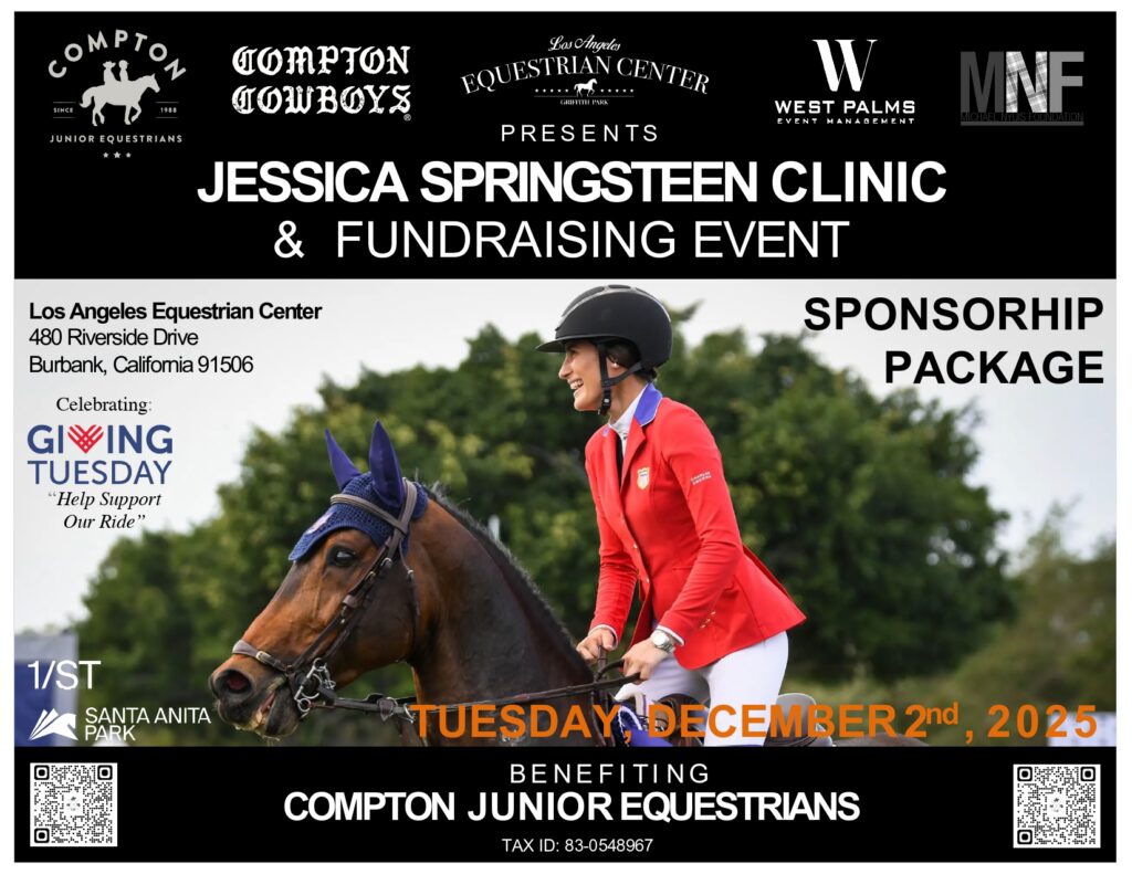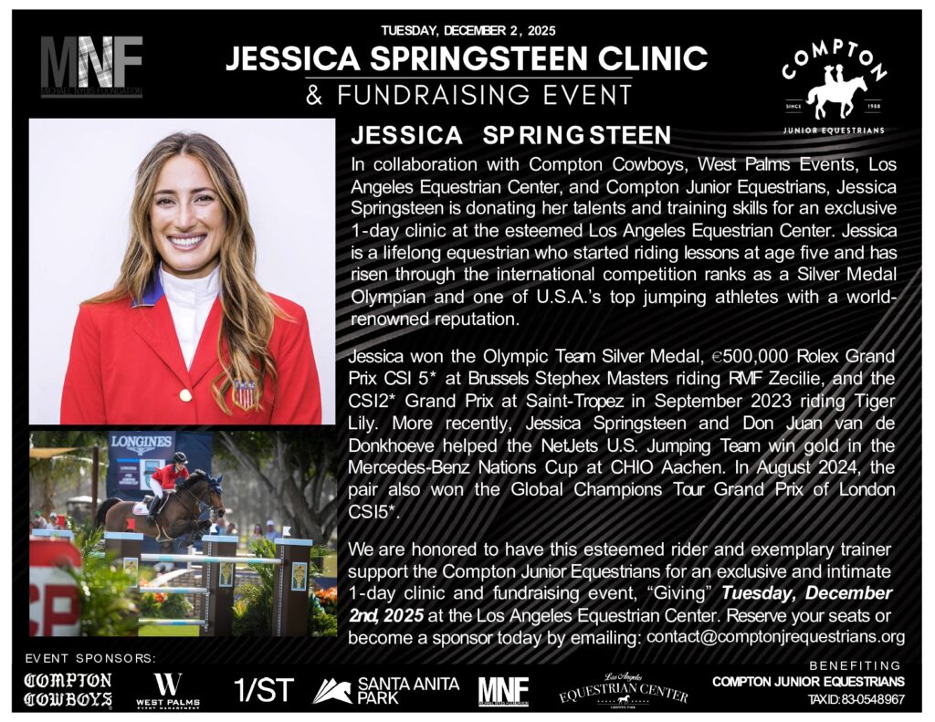 Join us for an intimate one-day clinic and fundraising event featuring U.S. Olympic Silver Medalist Jessica Springsteen at the Los Angeles Equestrian Center. This exclusive event benefits The Nyuis Foundation, and the Compton Junior Equestrians, who provide at-risk youth with opportunities through horsemanship, education, and mentorship.