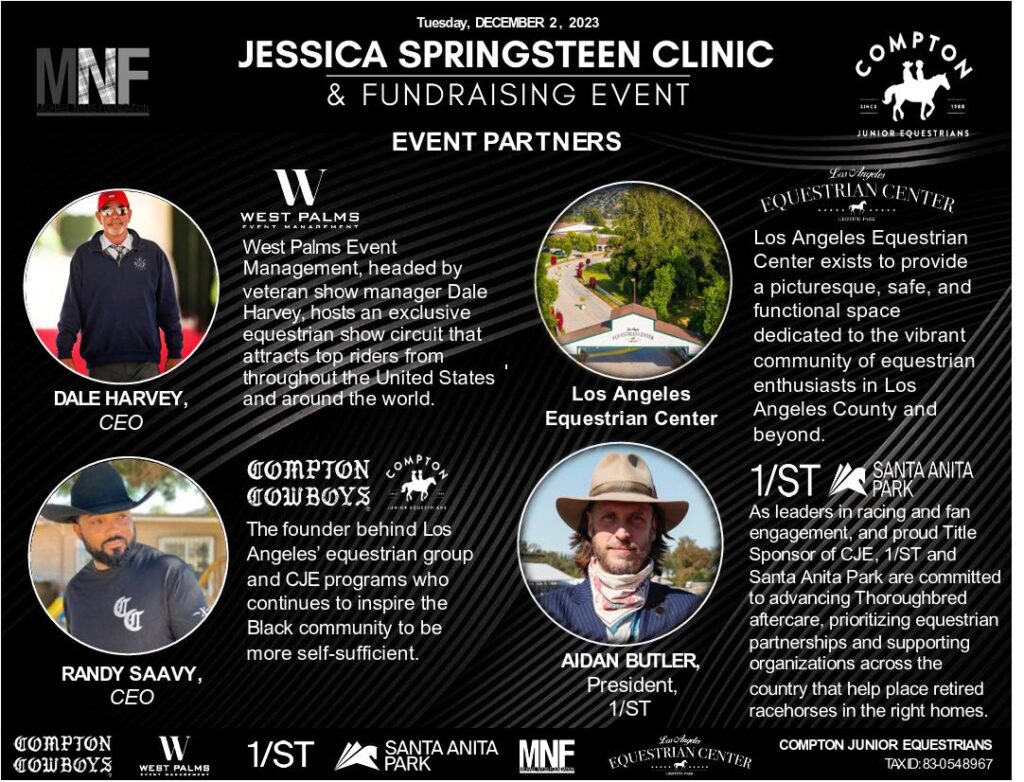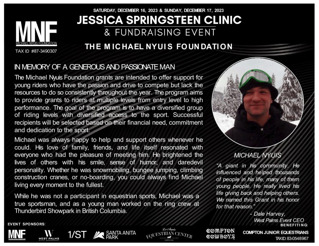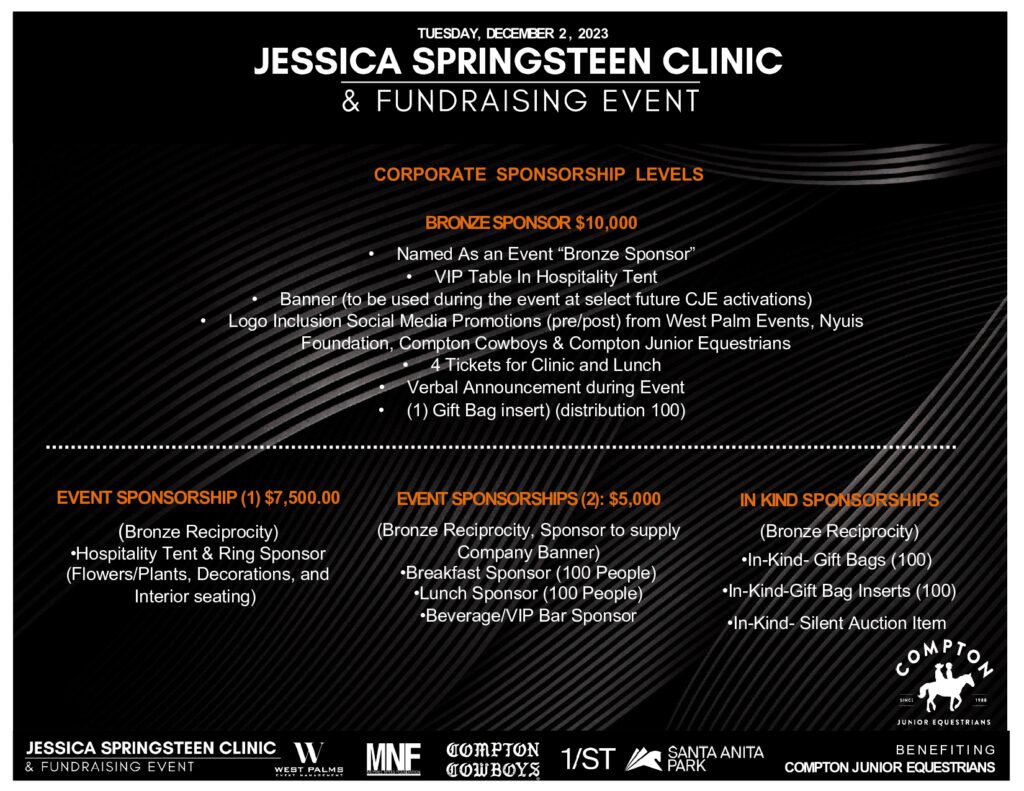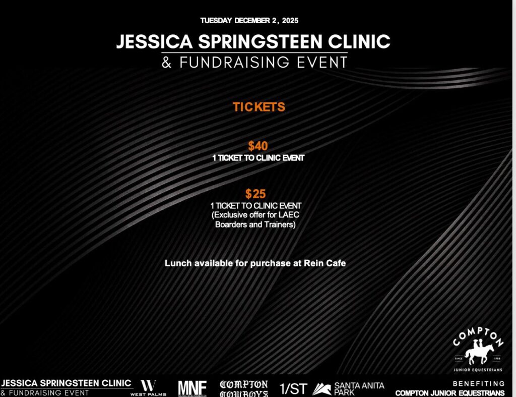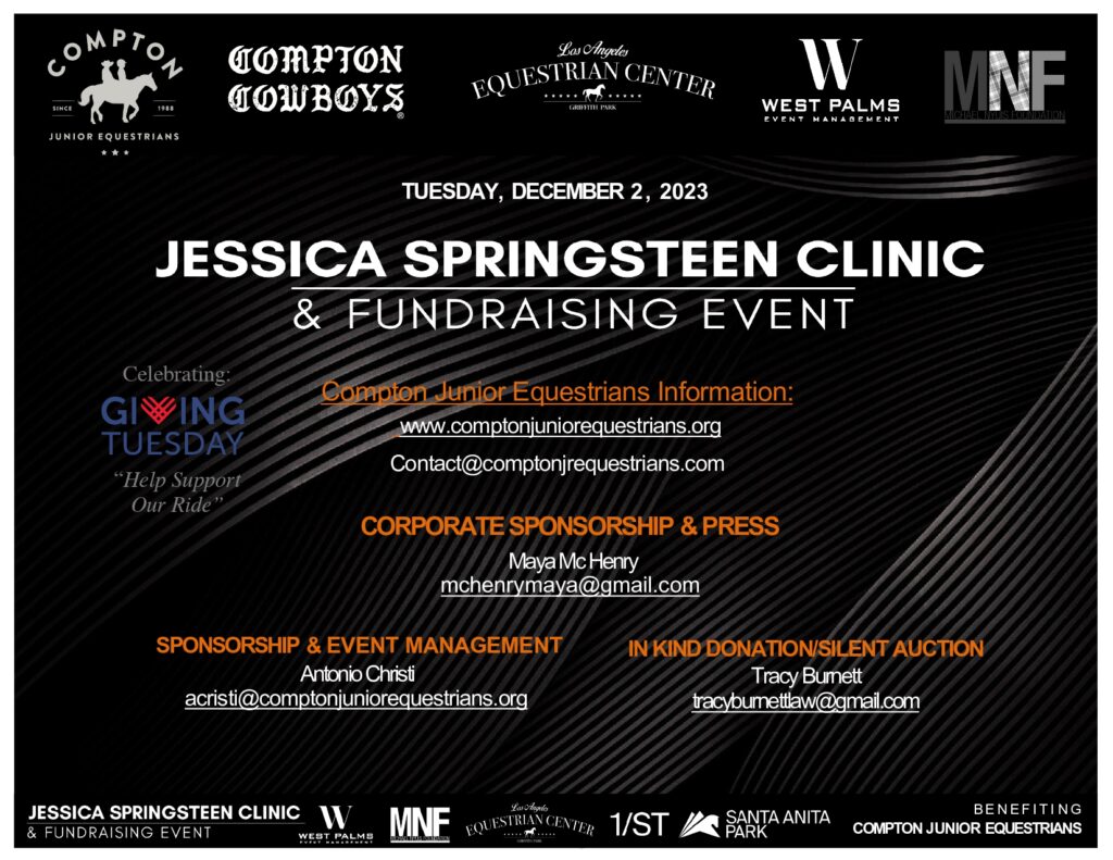 Join us for an intimate one-day clinic and fundraising event featuring U.S. Olympic Silver Medalist Jessica Springsteen at the Los Angeles Equestrian Center. This exclusive event benefits The Nyuis Foundation, and the Compton Junior Equestrians, who provide at-risk youth with opportunities through horsemanship, education, and mentorship.